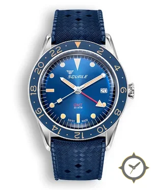Eine GMT-Uhr mit einem 35mm Gehäuse im Vintage-Stil gefertigt aus Edelstahl mit einem Zifferblatt in blau und einer besonderen "sunburst"-Oberfläche und einer echten GMT-Funktion, mit der du eine zweite Zeitzone verfolgen kannst.