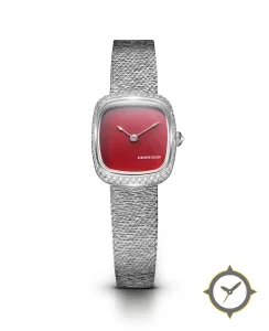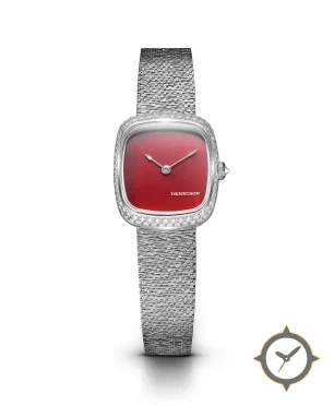 Eine Dress-Uhr mit einem 34.5mm Gehäuse im Vintage-Stil gefertigt aus Edelstahl mit einem Zifferblatt in rot und einer besonderen "lacquer"-Oberfläche.
