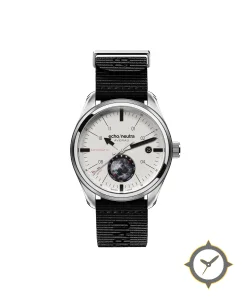 Eine Minimalistisch-Uhr mit einem vielseitigen 38mm Gehäuse, das an fast jedes Handgelenk passt, gefertigt aus Edelstahl mit einem Zifferblatt in weiß und einer besonderen "matte"-Oberfläche und einer wunderschönen Mondphasenanzeige.