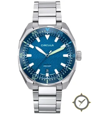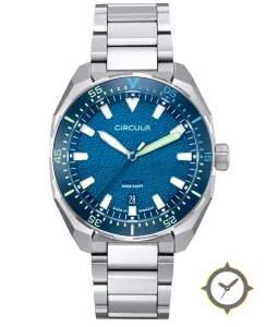 Eine Taucheruhr-Uhr mit einem 35.5mm Gehäuse im Vintage-Stil gefertigt aus Edelstahl mit einem Zifferblatt in blau und einer besonderen "textured waffle / hobnail finish"-Oberfläche.