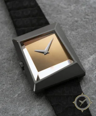 Eine Minimalistisch-Uhr gefertigt aus Titan mit einem Zifferblatt in gold und einer besonderen "highly polished / mirror finish"-Oberfläche.