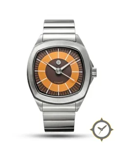 Eine Vintage-Uhr mit einem markanten 43.5mm Auftritt am Handgelenk, gefertigt aus Edelstahl mit einem Zifferblatt in orange und einer besonderen "matte"-Oberfläche.