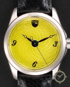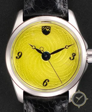 Eine Dress-Uhr mit einem 29mm Gehäuse im Vintage-Stil gefertigt aus Edelstahl mit einem Zifferblatt in gelb und einer besonderen "spiral guilloche"-Oberfläche.