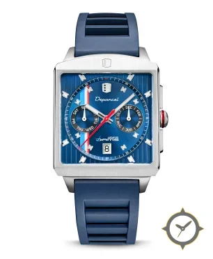 Eine Racing-Uhr mit einem markanten 49.5mm Auftritt am Handgelenk, gefertigt aus Edelstahl mit einem Zifferblatt in blau und einer besonderen "sunburst center with vertical striped outer chapter ring"-Oberfläche.