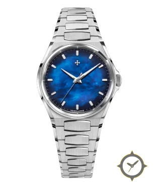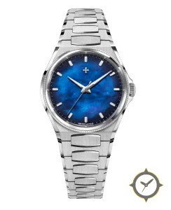 Eine Luxus-Uhr mit einem markanten 42mm Auftritt am Handgelenk, gefertigt aus Edelstahl mit einem Zifferblatt in blau und einer besonderen "mother-of-pearl"-Oberfläche.
