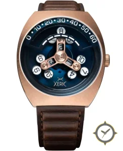 Eine Vintage-Uhr mit einem 36mm Gehäuse im Vintage-Stil gefertigt aus Gold mit einem Zifferblatt in blau und einer besonderen "sunburst"-Oberfläche.