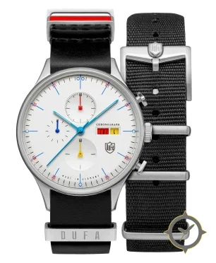 Eine Chronograph-Uhr mit einem markanten 45mm Auftritt am Handgelenk, gefertigt aus Edelstahl mit einem Zifferblatt in weiß und einer besonderen "matte"-Oberfläche.