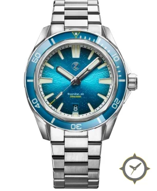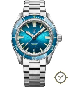 Eine Taucheruhr-Uhr mit einem 35.5mm Gehäuse im Vintage-Stil gefertigt aus Edelstahl mit einem Zifferblatt in türkis und einer besonderen "sunburst radial texture"-Oberfläche.