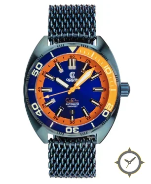 Eine Taucheruhr-Uhr mit einem markanten 44mm Auftritt am Handgelenk, gefertigt aus Edelstahl mit einem Zifferblatt in blau und einer besonderen "sunburst"-Oberfläche.