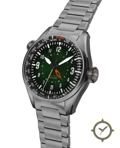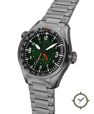 Eine GMT-Uhr mit einem markanten 45mm Auftritt am Handgelenk, gefertigt aus Edelstahl mit einem Zifferblatt in grün und einer besonderen "sunburst"-Oberfläche, ideal für Weltenbummler dank der Weltzeit-Funktion.