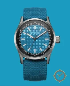 Eine Field-Uhr mit einem 36.5mm Gehäuse im Vintage-Stil gefertigt aus Edelstahl mit einem Zifferblatt in türkis und einer besonderen "square waffle / textured grid"-Oberfläche.
