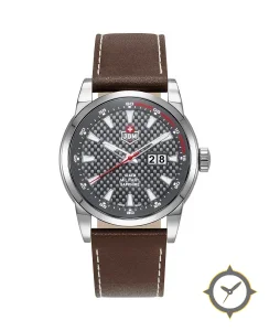 Eine Militär-Uhr mit einem markanten 49mm Auftritt am Handgelenk, gefertigt aus Edelstahl mit einem Zifferblatt in grau und einer besonderen "carbon fiber weave"-Oberfläche.
