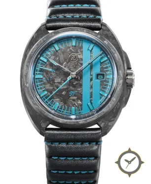 Eine Sport-Uhr mit einem vielseitigen 40mm Gehäuse, das an fast jedes Handgelenk passt, gefertigt aus Carbon mit einem Zifferblatt in türkis und einer besonderen "forged carbon / flake texture"-Oberfläche.