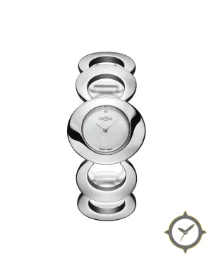 Eine Dress-Uhr mit einem 33mm Gehäuse im Vintage-Stil gefertigt aus Edelstahl mit einem Zifferblatt in weiß und einer besonderen "mother-of-pearl"-Oberfläche.