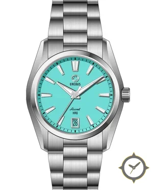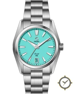 Eine Sport-Uhr mit einem 31.5mm Gehäuse im Vintage-Stil gefertigt aus Edelstahl mit einem Zifferblatt in türkis und einer besonderen "matte lacquer"-Oberfläche.