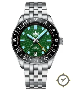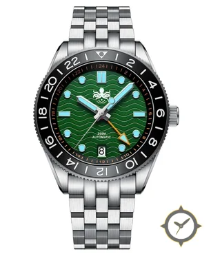 Eine GMT-Uhr mit einem markanten 47mm Auftritt am Handgelenk, gefertigt aus Edelstahl mit einem Zifferblatt in grün und einer besonderen "wavy"-Oberfläche und einer echten GMT-Funktion, mit der du eine zweite Zeitzone verfolgen kannst.