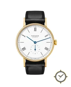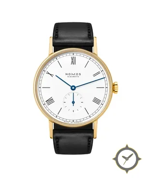 Eine Dress-Uhr mit einem 37.5mm Gehäuse im Vintage-Stil gefertigt aus Gold mit einem Zifferblatt in weiß und einer besonderen "lacquer"-Oberfläche.