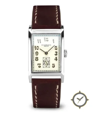 Eine Dress-Uhr mit einem 27mm Gehäuse im Vintage-Stil gefertigt aus Edelstahl mit einem Zifferblatt in weiß und einer besonderen "smooth lacquer"-Oberfläche.