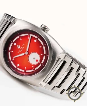 Eine Sport-Uhr mit einem vielseitigen 39.5mm Gehäuse, das an fast jedes Handgelenk passt, gefertigt aus Edelstahl mit einem Zifferblatt in rot und einer besonderen "sunburst gradient (fumé)"-Oberfläche.