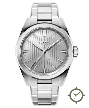 Eine Sport-Uhr mit einem markanten 43mm Auftritt am Handgelenk, gefertigt aus Edelstahl mit einem Zifferblatt in silber und einer besonderen "vertical striped (teak-style)"-Oberfläche.