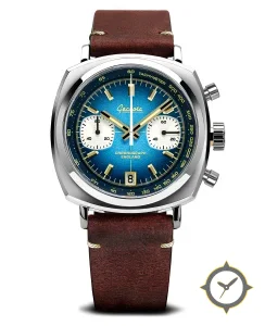 Eine Chronograph-Uhr mit einem vielseitigen 40mm Gehäuse, das an fast jedes Handgelenk passt, gefertigt aus Edelstahl mit einem Zifferblatt in blau und einer besonderen "sunburst gradient"-Oberfläche.