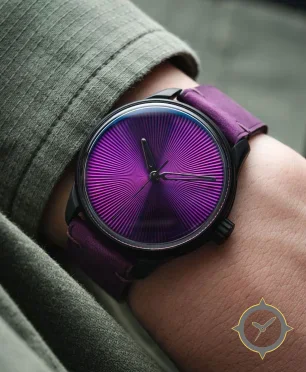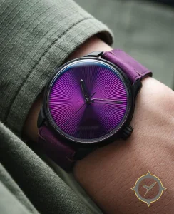 Eine Minimalistisch-Uhr mit einem markanten 46.5mm Auftritt am Handgelenk, gefertigt aus Beschichtung mit einem Zifferblatt in lila und einer besonderen "radial guilloché (sunburst)"-Oberfläche.