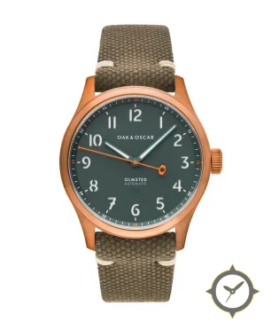 Eine Field-Uhr mit einem vielseitigen 41mm Gehäuse, das an fast jedes Handgelenk passt, gefertigt aus Bronze mit einem Zifferblatt in grün und einer besonderen "matte"-Oberfläche.