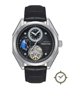 Eine Skelett-Uhr mit einem markanten 46mm Auftritt am Handgelenk, gefertigt aus Edelstahl mit einem Zifferblatt in schwarz und einer besonderen "textured matte with open-heart aperture"-Oberfläche.