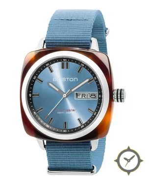 Eine Vintage-Uhr mit einem 35mm Gehäuse im Vintage-Stil gefertigt aus Harz mit einem Zifferblatt in blau und einer besonderen "sunburst"-Oberfläche.