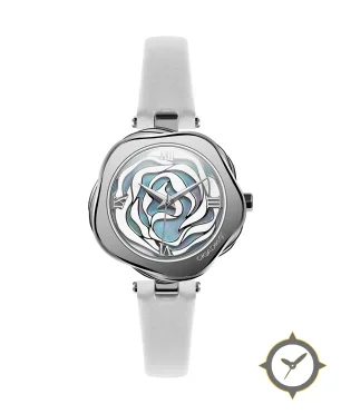 Eine Dress-Uhr gefertigt aus Edelstahl mit einem Zifferblatt in weiß und einer besonderen "mother-of-pearl"-Oberfläche.