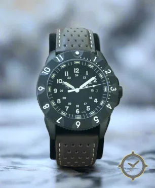 Eine Militär-Uhr mit einem markanten 43mm Auftritt am Handgelenk, gefertigt aus Edelstahl mit einem Zifferblatt in schwarz und einer besonderen "matte"-Oberfläche.