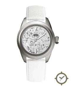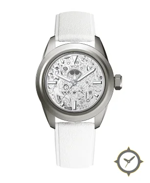 Eine Tool-Uhr mit einem vielseitigen 39mm Gehäuse, das an fast jedes Handgelenk passt, gefertigt aus Titan mit einem Zifferblatt in weiß und einer besonderen "etched/engraved illustrated doodle texture"-Oberfläche.