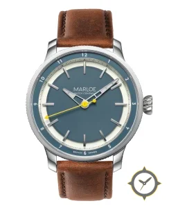 Eine Minimalistisch-Uhr mit einem 36.5mm Gehäuse im Vintage-Stil gefertigt aus Edelstahl mit einem Zifferblatt in blau und einer besonderen "matte"-Oberfläche.