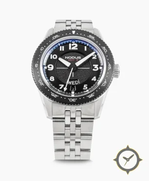 Eine Taucheruhr-Uhr mit einem markanten 41.5mm Auftritt am Handgelenk, gefertigt aus Edelstahl mit einem Zifferblatt in schwarz und einer besonderen "grained/textured central disk with matte outer ring"-Oberfläche.