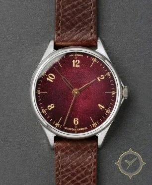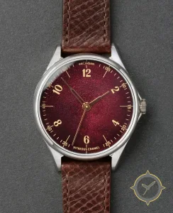 Eine Dress-Uhr mit einem 34.5mm Gehäuse im Vintage-Stil gefertigt aus Edelstahl mit einem Zifferblatt in karmesinrot und einer besonderen "vitreous enamel, granular/mottled finish"-Oberfläche.
