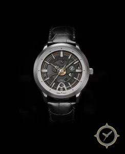 Eine Skelett-Uhr mit einem 33mm Gehäuse im Vintage-Stil gefertigt aus Edelstahl mit einem Zifferblatt in schwarz und einer besonderen "skeletonized / open-work with textured bridges and visible gears"-Oberfläche.
