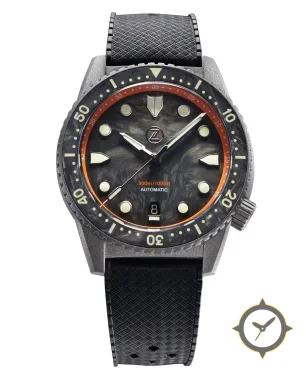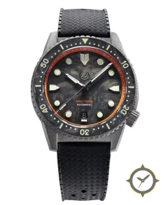 Eine Taucheruhr-Uhr mit einem vielseitigen 40mm Gehäuse, das an fast jedes Handgelenk passt, gefertigt aus Edelstahl mit einem Zifferblatt in schwarz und einer besonderen "smoky/marbled finish"-Oberfläche.
