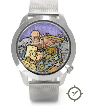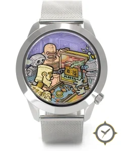 Eine Vintage-Uhr mit einem markanten 52.5mm Auftritt am Handgelenk, gefertigt aus Edelstahl mit einem Zifferblatt in lila und einer besonderen "printed pop-art illustration"-Oberfläche.