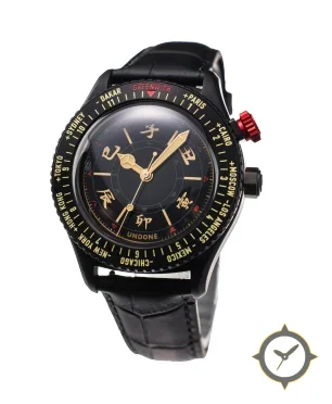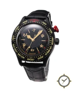 Eine Weltzeituhr-Uhr mit einem vielseitigen 39mm Gehäuse, das an fast jedes Handgelenk passt, gefertigt aus Edelstahl mit einem Zifferblatt in schwarz und einer besonderen "lacquer"-Oberfläche, ideal für Weltenbummler dank der Weltzeit-Funktion.