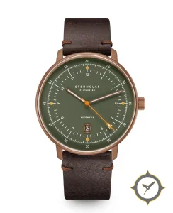 Eine Minimalistisch-Uhr mit einem markanten 42mm Auftritt am Handgelenk, gefertigt aus Bronze mit einem Zifferblatt in grün und einer besonderen "matte"-Oberfläche.