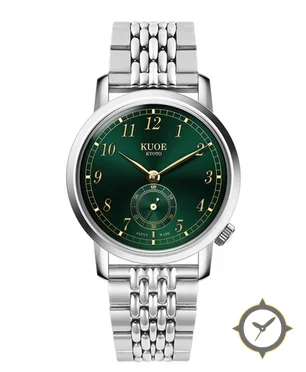 Eine Dress-Uhr mit einem 32mm Gehäuse im Vintage-Stil gefertigt aus Edelstahl mit einem Zifferblatt in grün und einer besonderen "sunburst"-Oberfläche.