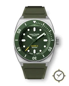 Eine Taucheruhr-Uhr mit einem 33mm Gehäuse im Vintage-Stil gefertigt aus Edelstahl mit einem Zifferblatt in grün und einer besonderen "matte"-Oberfläche.