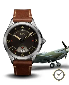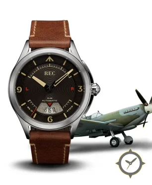 Eine Luftfahrt-Uhr mit einem 35.5mm Gehäuse im Vintage-Stil gefertigt aus Edelstahl mit einem Zifferblatt in braun und einer besonderen "textured/grain with concentric circular guilloche in the center"-Oberfläche.