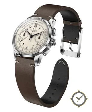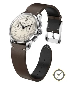 Eine Chronograph-Uhr mit einem 36mm Gehäuse im Vintage-Stil gefertigt aus Edelstahl mit einem Zifferblatt in weiß und einer besonderen "matte"-Oberfläche.