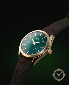 Eine Dress-Uhr mit einem 35.5mm Gehäuse im Vintage-Stil gefertigt aus Gold mit einem Zifferblatt in grün und einer besonderen "guilloché / textured sunburst"-Oberfläche.
