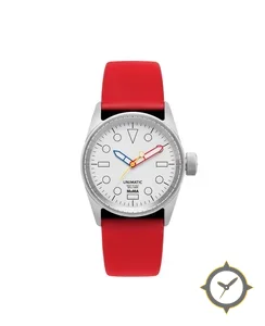 Eine Minimalistisch-Uhr mit einem 36mm Gehäuse im Vintage-Stil gefertigt aus Edelstahl mit einem Zifferblatt in weiß und einer besonderen "matte"-Oberfläche.