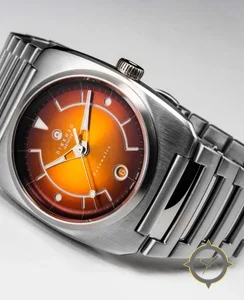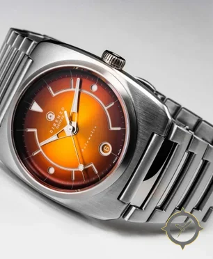 Eine Sport-Uhr mit einem markanten 41.5mm Auftritt am Handgelenk, gefertigt aus Edelstahl mit einem Zifferblatt in orange und einer besonderen "sunburst"-Oberfläche.