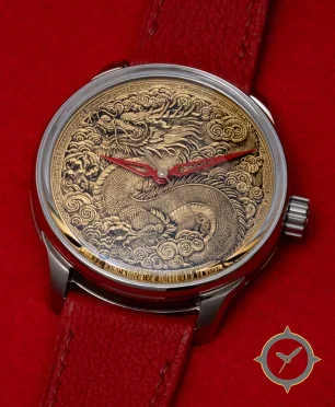Eine Luxus-Uhr mit einem 34.5mm Gehäuse im Vintage-Stil gefertigt aus Edelstahl mit einem Zifferblatt in gold und einer besonderen "engraved"-Oberfläche.