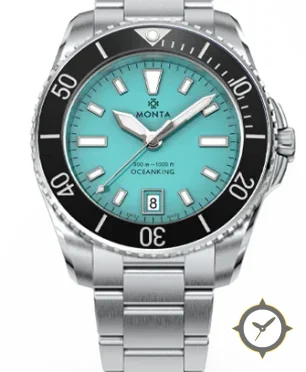 Eine Taucheruhr-Uhr mit einem 37mm Gehäuse im Vintage-Stil gefertigt aus Edelstahl mit einem Zifferblatt in türkis und einer besonderen "matte"-Oberfläche.