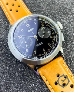 Eine Chronograph-Uhr mit einem markanten 42.5mm Auftritt am Handgelenk, gefertigt aus Edelstahl mit einem Zifferblatt in schwarz und einer besonderen "glossy"-Oberfläche.
